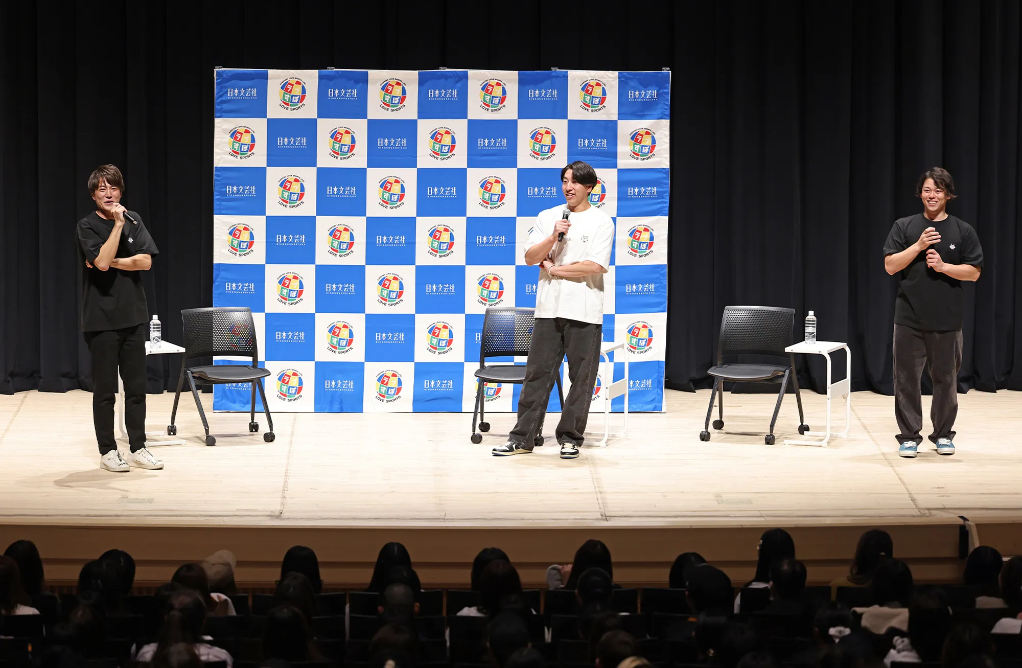 高梨投手がシーズン中、ユニフォームのいわゆる“社会の窓”が開いていたのが中継で映し出されたことについて質問されたのをきっかけに、「お二人の年の差を感じることがあるか?」「160キロを投げるにはどうすればいいか?」「遠征時など、どんな本を読んでいるか?」などの質問が。また3人それぞれの母校出身のお客さんが会場に来ていて、お客さんと学校ネタで盛り上がりました。